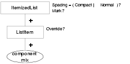 ItemizedList contains one or more ListItem elements, which contain one or more object-level elements from the %component.mix; mixture. ItemizedList has an optional Spacing attribute, which indicates the relative desired compactness of the list, and an options Mark attribute, which is a keyword that indicates a prefix for the list (e.g. bullet, dash, checkbox). Note that the list of keywords and defaults are implementation specific. ListItem contains one or more object-level elements from the %component.mix; mixture. ListItem has an optional Override attribute, which can be a character or string which is intended to replace the default mark for an individual item only. The default for this attribute is implementation specific. OrderedList