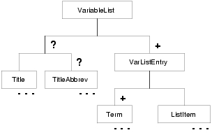 VariableList contains an optional Title and TitleAbbrev, and one or more VarListEntry elements, which in turn contain one or more Term elements and a ListItem. VariableList has an optional TermLength attribute, which indicates, in the same units that table ColWidth accepts, the approximate length of the term content that should fit onto one line. GlossList