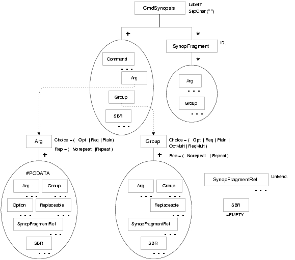 CmdSynopsis contains a mixture or one or more Command, Arg, Group, SBR, in any order followed by any number of SynopFragment elements. CmdSynopsis has a Sepchar attribute, which indicates the character that should be used to separate command and all top-level arguments (an alternative value might be Δ), and an optional Label attribute. SynopFragment contains a mixture of any number of Arg or Group elements in any order. SynopFragment has a required Linkend attribute to link to related information. Arg contains a mixture of one or more Arg, Group, Option, Replaceable, SynopFragmentRef, SBR, and #PCDATA in any order. Arg has a Choice attribute which indicates whether an argument must be supplied (this default is optional); and a Rep attribute, which indicates whether the argument is repeatable (this default is Norepeat). Group contains a mixture of one or more Arg, Group, Option, Replaceable, SynopFragment, SynopFragmentRef, and SBR elements, in any order. Group has a Choice attribute, which indicates whether an argument must be supplied (this default is optional); and a Rep attribute, which indicates whether the argument is repeatable (this default is Norepeat). SynopFragmentRef contains RCDATA and has a required Linkend attribute to link to related information. FuncSynopsis